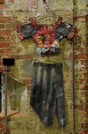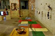 Die Installation „Sesa Beye (Collect to Create)“ problematisiert mittels der Tausenden in Accra zu beobachtenden „trucks“– mit PKW-Rädern ausgestatteter, improvisierter Minitransportvehikel, die von „scrapmen“ (Schrottsammlern) in jede Ecke Accras geschoben und gezogen werden, um auch den letzten eingesammeltem Elektronikschrott, Computermüll, die letzten Kühlschrank- und Autoteile zum Weiterverkauf zunächst auf den individuellen Schrotthof zu bringen– die Bewegung von Industrieabfall europäischen Ursprungs in Afrika. Die Spuren dieser für Mensch und Umwelt gefährlichen, jedoch Beschäftigung und damit Verdienst bringenden Materialien lassen sich von den Straßen Accras bis in die westliche Welt zurückverfolgen. Seinen derzeitigen Brennpunkt findet diese Schrottverwertungsbewegung seit nur wenigen Jahren im neuen, wie ein Geschwür entstandenen, zentral gelegenen Slum „Sodom and Gomorrha“, einem weißen Fleck auf dem Stadtplan Accras, bevölkert mit 50.000 Menschen auf engstem Raum, Tendenz steigend, einer von Asche überzogenen, brennenden, giftig stinkenden Vorhölle, dem Armenhaus der Metropole.