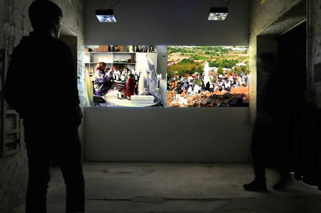 In der Video-Doppelprojektion „Pygmalion“ (2011) nehmen Helmut und Johanna Kandl Bezug auf den griechischen Mythos des Bildhauers, dessen Skulptur lebendig wird, und den Ovid in seinen um Christi Geburt geschriebenen „Metamorphosen“ niederschrieb. Die linke Projektion zeigt Aufnahmen aus La Fabrique in Lourdes, eine Manufaktur, die seit vielen Jahrzehnten Repliken der (Lourdes-)Madonna, aber auch anderer Heiliger produziert. Man sieht Gips, Gussformen, halbfertige Heiligenfiguren, die wie eine Armee bereit stehen– tausendfach zu verkaufende Handelsware. Die rechte Projektion zeigt Situationen, in der das Bild schon „lebendig“, „beseelt“ und zum magischen Gegenstand geworden ist: Heiligenfiguren werden ununterbrochen gestreichelt, auf den Rücken geschnallt fortbewegt, auf den Knien rutschend in den Armen getragen. Wo und in welchem Moment geschieht die Wandlung von der Handelsware zum auratischen, verehrten, heiligen Gnadenbild? Die Tonspur des Videos nimmt Bezug auf die Operette „Die schöne Galathée“ von Franz von Suppé, die den Pygmalion-Mythos Mitte des 19. Jahrhunderts, also zur Zeit der Ersterscheinung Bernadette Soubirous’ in Lourdes, zu einer Operette verarbeitet und trivialisiert.