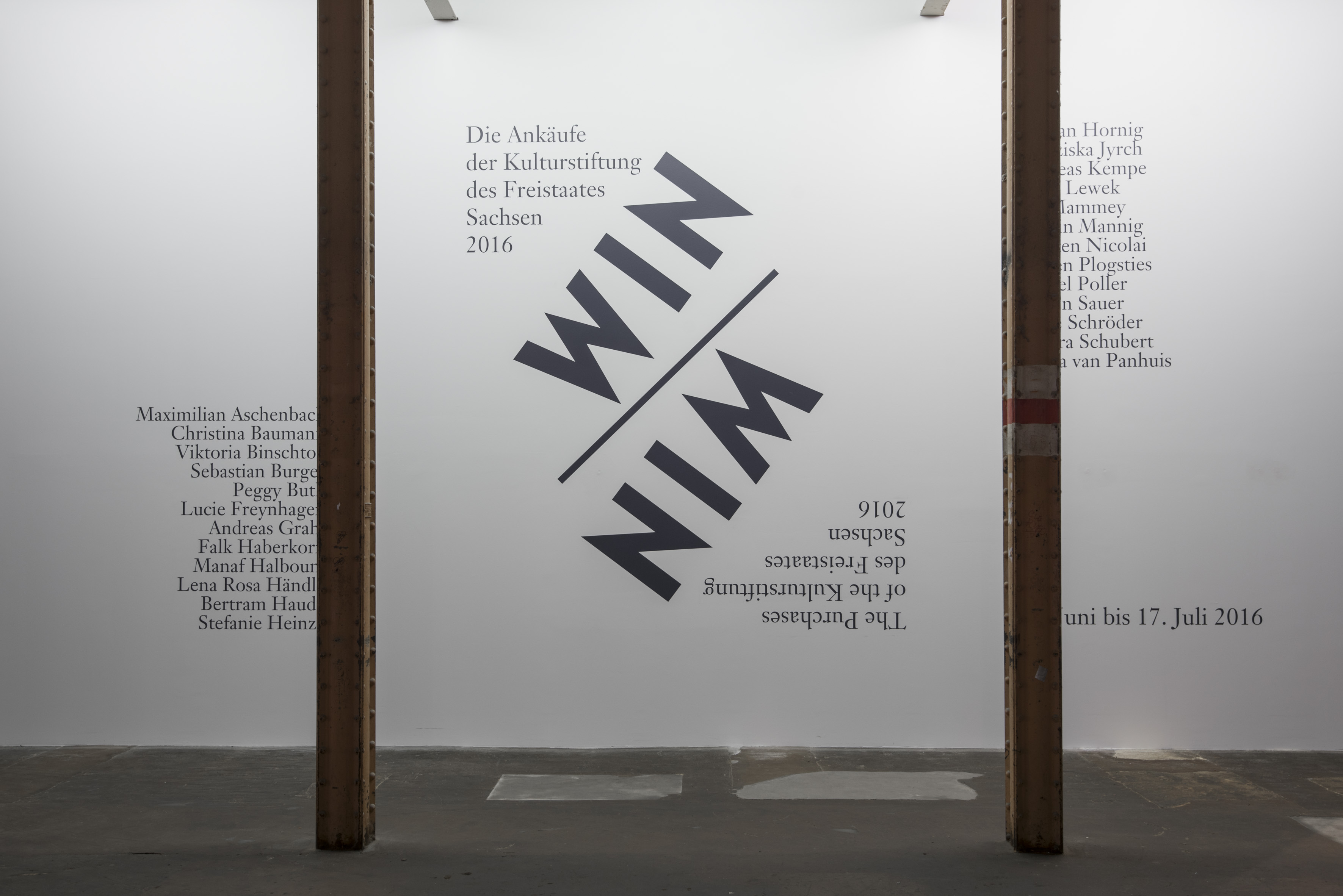 Vom 25. Juni bis zum 17. Juli 2016 werden die Kunstwerke im Rahmen der Ausstellung WIN/WIN in der HALLE 14 auf dem Gelände der Leipziger Baumwollspinnerei gezeigt. Der aktuelle Ankaufsjahrgang zeichnet sich u.a. durch Werke aus, die zu aktuellen gesellschaftlichen Themen Stellung nehmen. So illustriert die Installation »Arbeit am Mythos« von Luise Schröder die Entstehung und Reproduktion des sogenannten »Mythos Dresden«. Die Serie »Goldrausch« von Falk Haberkorn ist das Ergebnis einer 8.000 Kilometer langen Reise durch Ostdeutschland. Sie versteht sich als fotografische Bestandsaufnahme eines nach wie vor im Umbruch befindlichen Landes. Der aus Syrien stammende Manaf Halbouni nimmt mit »AL KIFAH« Bezug auf Protest, Flucht und Gewalt in seinem Heimatland. Die Ausstellung dokumentiert insgesamt aktuelle Tendenzen in der Bildenden Kunst in heraus-ragender Qualität. Die angekauften Arbeiten gehen als Schenkung der Kulturstiftung des Freistaates Sachsen in die Obhut der Staatlichen Kunstsammlungen Dresden über.