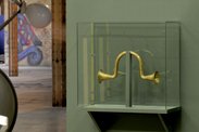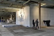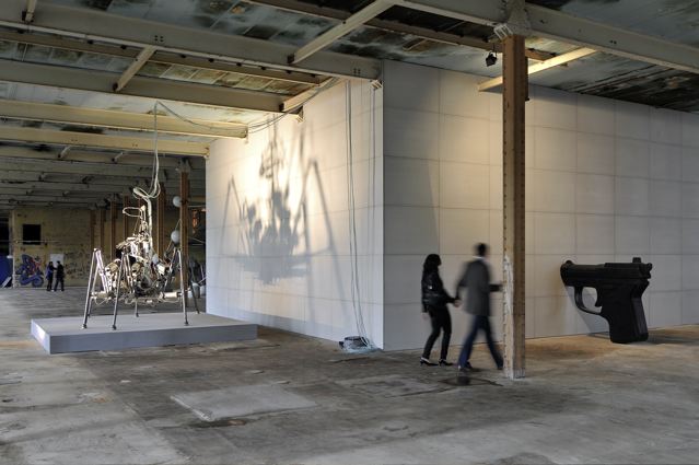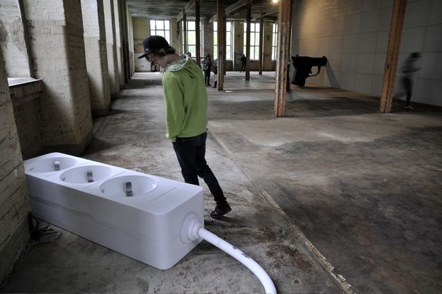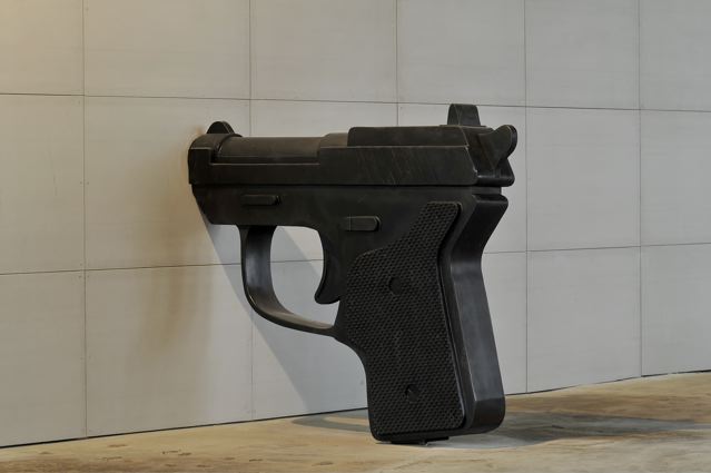 Vorlage einer gigantischen Schusswaffe von BDU war eine Spielzeugpistole. Betritt man die Ausstellungsbox, sieht man zunächst ein Loch in der Wand, nicht ahnend, dass dies der vordere Teil eines Pistolenlaufs samt Geschoss ist. Im Hinterland des Schauraums und in seiner wahren Größe auf ihn gerichtet, tritt das Handfeuergerät schließlich in Erscheinung und, als hätte der Slogan „size matters“ („auf die Größe kommt es an“) seine Wirkung verfehlt, scheint es an Macht und Potenz eher verloren zu haben, als sie zu symbolisieren. Das „Rohr“ - aus dem Tschechischen (pÚťala)– ist als „Feuerfaust“, wirkungsvolle Verlängerung von Hand und Arm, nicht länger vorstellbar. Ein ebenso überdimensionierter Dreifachstecker, ob nun Sinnbild für den Fetischcharakter der Ware, überbordende Produktion oder permanente Reproduktion, verweigert gleichermaßen seine Dienste, ist Opfer eines Kurzschlusses, sprüht Funken, hin und wieder zumindest.