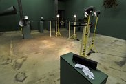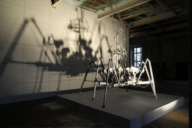 „Dies ist wohl die erste Performance, die für das Publikum gefährlicher ist, als für den Artisten.“ Was der australische Performance-und Medienkünstler Stelarc damit beschreibt, ist ein Auftritt mit seinem Exoskeleton, einem sechsbeinigen Laufroboter mit einem Durchmesser von drei Metern und einem Gewicht von 600 Kilogramm. Dieser in zahlreichen Performances verwendete Apparat wurde bereits 1998 in Kooperation mit dem f18institut und Kampnagel Hamburg produziert und entwickelt. Der Künstler steht dabei wie ein Marionettenspieler in der Mitte eines spinnenartigen Gerüsts auf einer Plattform, die um 360 Grad rotieren kann. Mit seinen beiden Armen, die über Sensoren mit der Maschine verbunden sind, kann er die sechs Beine des Geräts steuern.