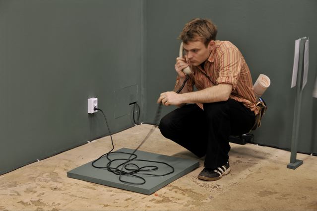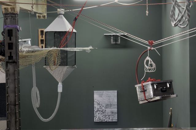 Das Konzept „als geistige Apparatur, oft vorgeschlagen, umgebaut, verworfen und wieder ausgegraben“ (Björn Jung) übt dabei keine zu unterschätzende Scharnierfunktion zwischen Idee und Umsetzung aus, bildet eine Schnittstelle, wenngleich das Interface als solches ein Teil eines Systems ist, das dem Austausch von Informationen, Energie oder Materie mit anderen Systemen dient. Über ein räumliches Interface, das die körperliche Präsenz von Menschen simulieren kann, werden in „Sonar“ zwei identische Räume miteinander verbunden. Das Interface besteht aus jeweils einem frei beweglichen Pendel und einem Ensemble aus acht Lautsprechern zur Erzeugung von Raumklang. Verbunden mit „Sonar“ ist die Frage, inwiefern Phänomene der Simulation von raumzeitlicher Wahrnehmung und ihre Gleichzeitigkeit in der zwischenmenschlichen Verständigung zu neuen Qualitäten, aber auch zu Missverständnissen, Irrungen und Verrenkungen führen können. In seinem Versuchsaufbau geht es Björn Jung um das körperliche Aufspüren dieser Phänomene. Setzen die Ausstellungsbesucher das Pendel der Installation in Schwingung, wird dadurch in einem zweiten Raum eine Phantomschallquelle in synchrones Schwingen gebracht. Von diesem zweiten Raum aus kann nun eine weitere Person über ein zweites Pendel mit der Person im ersten Raum Kontakt aufnehmen und deren Phantomschallquelle zum Schwingen bringen.
