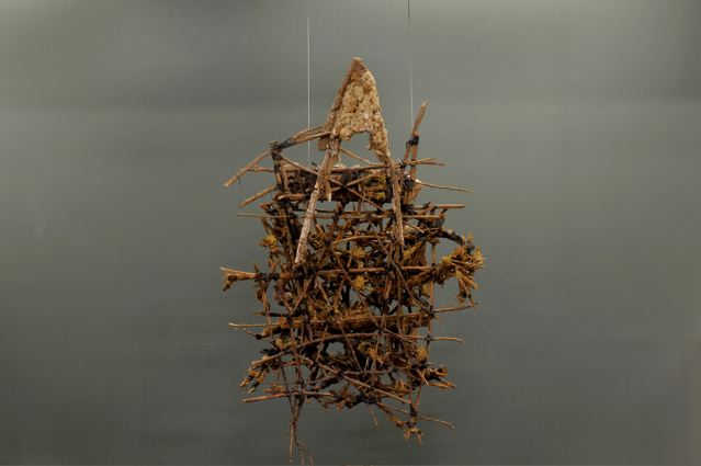 Krieg, Heilung und Zerstörung sind die zentralen Themen im künstlerischen Werkweg von Kim Jones, der von 1967 bis 1968 als Marinesoldat im Vietnamkrieg kämpfte. Maßgeblich hierbei ist für den US-Amerikaner das Ausloten des Gegensatzes zwischen gefühlter Stärke und gleichzeitiger Verletzlichkeit. Das Alter Ego des Performancekünstlers, „Mudman“ („Schlammmann“), tauchte erstmals Mitte der 1970er in den Straßen von Los Angeles und Santa Monica auf. Die Maskerade des Mudman ist eine Art organischer Ganzkörperanzug. Wie der Name bereits vermuten lässt, trägt Mudman auf seiner Haut meist nur zentimeterdicke Schlamm-und andere Sedimentschichten, während sein Gesicht mit einem Nylonstrumpf getarnt ist. Das Markenzeichen dieser Figur ist ein Holzgestell, das sie wie ein Kruzifix auf dem Rücken trägt. Gezimmert aus Holz, Klebeband, Bindfaden, Käse und Leinen, überzogen mit Wachs, Farbe und Schellack, überragt es weit ausladend den Kopf seines Trägers. Seinen Kopf ziert eine Bedeckung aus Schaumgummi, Baumwolle, Maschendrahtzaun, Bambus, Nylon und Garn. Das erste Holzkonstrukt baute Kim Jones 1974. Darauf folgten noch mehrere kleinere Modelle, die Jones allerdings fast alle zerstörte, so dass lediglich die erste, 82 Kilogramm schwere, Urkonstruktion und ein kleines Modell aus dem Jahr 1983 bis heute erhalten sind. Anfangs hatte das Gestell noch ein gelbliches, klebriges, insektenhaftes Aussehen, das sich allerdings im Laufe der Zeit aufgrund des natürlichen Verfalls der Materialien wandelte und nachdunkelte.