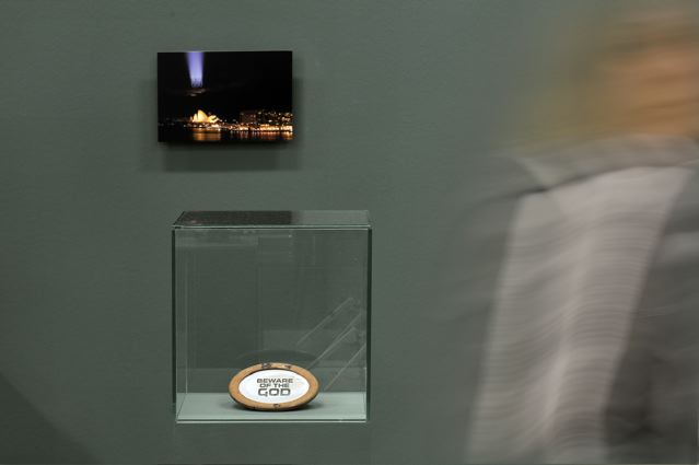 Zu dieser Zeit realisierte Deborah Kelly, deren Interventionen auf ein breites Publikum und auf symbolische Orte der Macht zielen, das Projekt „Beware of the God“ für das Museum of Contemporary Art in Sydney. Dabei handelt es sich um ein Wortspiel mit dem englischen Äquivalent der Warnung „Vorsicht bissiger Hund!“ - „Beware of the Dog!“ Das Multimediaprojekt umfasste neben einem Weblog, Metallplaketten, Aufklebern und animierten Werbefilmen spektakuläre Projektionen in den Wolkenhimmel über Sydney. Das in der Ausstellung gezeigte, durch Hitze leicht angesengte Diapositiv wurde in einen riesigen Flutscheinwerfer geschoben, der Kellys Warnung vor falschen Versprechungen in den Novemberhimmel projizierte. Kelly berichtet, dass sie sich seit 1993 einen solchen Projektor wünschte, doch er musste erst erfunden werden. Der Franzose Sydney Bouhaniche baute ihn in seiner Pariser Werkstatt und brachte ihn - einer Romanze folgend - nach Australien. Hier kreuzten sich Kellys und Bouhaniches Wege. Obwohl der Erfinder des ersehnten Projektors nicht daran glaubte, dass Wolkenprojektionen möglich wären, wagte die Künstlerin das Experiment und investierte das gesamte Projektbudget des Kunstmuseums für die zehnwöchige Technikmiete. „Ich war zu dieser Zeit eine lebende Wetterfahne und betete für Wolken am blauen Himmel. Doch die Wettergötter mieden mich! Und als Wolken kamen, waren es tief hängende Regenwolken - zu gefährlich, weil das Gerät ruiniert und wir von Stromschlägen bedroht gewesen wären“, schildert Kelly. Schließlich gelangen ihr in fünf Nächten die ersehnten Projektionen. Lief alles perfekt, hörte sie vom Dach des Museums, auf dem der Projektor stand, die Rufe erstaunter Menschen in den umliegenden Straßen. Die beeindruckenden Bilder der Projektion über der Sydney Opera kommentierte Kelly mit: „Ich schwöre, es ist kein Photoshop! Es ist Magie aus der Wirklichkeit!“