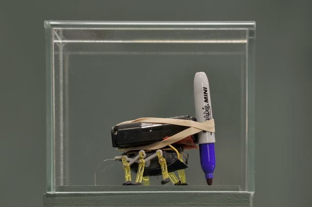 Spielzeug, das seine Fahrtrichtung nach Zufallsprinzip wählt, für präzise Malereien eignet. Jackoon wurde nach den beiden Abstrakten Expressionisten Jackson Pollock (1912-1956) und Willem de Kooning (1904-1997) benannt. „Hacked Hexbug“ (2008) ist ein handelsüblicher, von Torres manipulierter Spielzeugroboter, der vorprogrammiert auf seine Umwelt reagieren kann. Statt ein aufwändiges Bewegungssytem für einen Artbot zu entwickeln, fügte er dem Produkt lediglich einen Stift hinzu. „Hexie“ (2009) ist der zweite Prototyp eines gehackten HexBug. Seine Größe