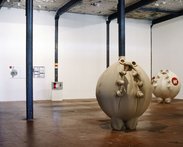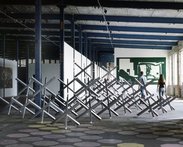 Lucas Lenglet versperrt den Zugangsraum zur Ausstellung installativ mit seinen „no title, anti-tank emplacements“– aufeinander gestapelten minimalistischen Skulpturen, die an Panzersperren erinnern, aus der Sicherheitszone eine Gefahrenzone machen und Sinnbilder der Aus- und Eingrenzung von Menschen erzeugen.