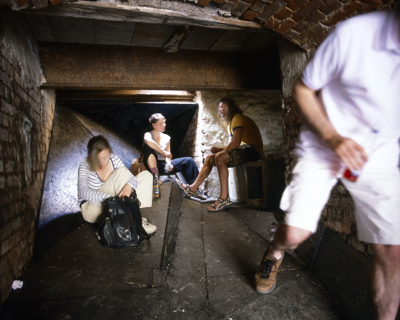 Peter Bux untersuchte analytisch ermittelte Fluchtbewegungen bei Gefahrensituationen in Bauwerken (hier der Halle 14) und leitete daraus grafische Modellvorstellungen von Idealpanik, ortspezifisch „angewandter“ Panik und deren nutzbarer Bodenfläche ab.