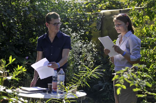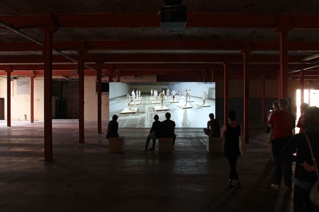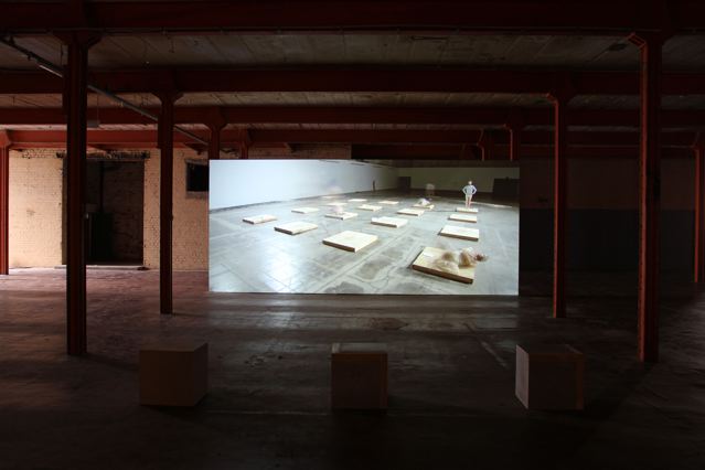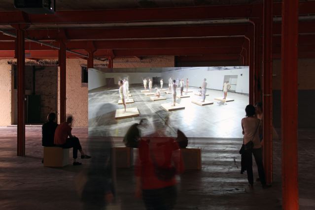 Ende des 19. Jahrhunderts gebaut ist die Leipziger Baumwollspinnerei eine prototypisches Beispiel für ein Gesamtkonzept, mit welchem Arbeit, städtisches Wohnen und Freizeit sowohl verbessert als auch reguliert und normiert wurden. Man stelle sich einen Arbeiter in den Produktionshallen der Spinnerei vor, der vor oder nach der Arbeit seinen „heilgymnastischen Freiübungen“ im Wohnzimmer oder im Garten nachgeht. Die Installation von Jesse Aron Green demonstriert weder Widerstand noch Unterwerfung. Die Performer in der großformatigen HD-Videoinstallation brechen aus dem festgelegten Raster aus, um wieder einzutreten und es erneut zu verlassen. In Bezug auf den Konzeptkünstler Sol LeWitt sieht man im Video, dass Green den Raum durch quadratische Bodenskulpturen gliedert, die gleichzeitig eine individuelle Bühne für den einzelnen Performer markieren. Diese Gliederung setzt sich im Raum der Installation fort durch kubische Skulpturen. Während die Kuben als Sitzgelegenheit dienen, stellen sie eine Beziehung her zwischen dem Betrachter und dem Performer der Übungen.