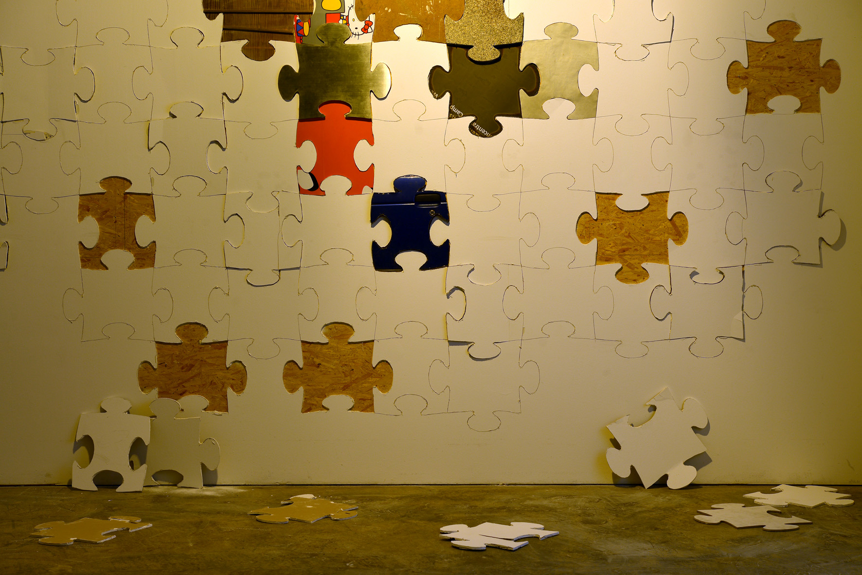 In Leipzig hat das Kollektiv die Werkserie „It’s The Wall World“ fortgeführt. Bruchstücke aus verschiedenen Teilen der Welt und gesellschaftlichen Milieus werden zu einem Puzzleobjekt kombiniert: die weiße Galeriewand trägt Fragmente scheinbar trivialer Orte. Die am jeweiligen Ort hinterlassene Lücke wurde durch ein passendes Gegenstück wieder geschlossen.