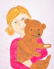 Ein halbes Leben später malt Marlene Rosenthal ein Selbstporträt von sich und dem Bären. Sie macht erst eine Vorzeichnung mit Bleistift, arbeitet dann mit Wachsmalstiften weiter, an einigen Stellen schimmert die Vorzeichnung durch. Marlene schaut genau hin, beobachtet die struppige Struktur des Bärenfells, die Flauschigkeit des pinken Wollpullovers. Sie gibt ihrem Gesicht mit Strich und Schatten große Ausdruckskraft, erfasst die Farbe und Struktur ihres Haars und achtet besonders bei den Augen auf kleinste Details. Sie sieht, wie die Lidfalte sich über die Augen wölbt und wie das Licht in der Pupille reflektiert wird.