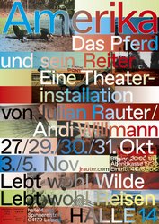 „Das Pferd und sein Reiter“ bildet den Auftakt der mehrteiligen Theaterserie „AMERIKA“ von Theatermacher Julian Rauter und Bühnenbildnerin Andi Willmann. Beide arbeiten seit 2013 kontinuierlich an gemeinsamen Projekten an der Schnittstelle zwischen Theater, bildender Kunst und Architektur.