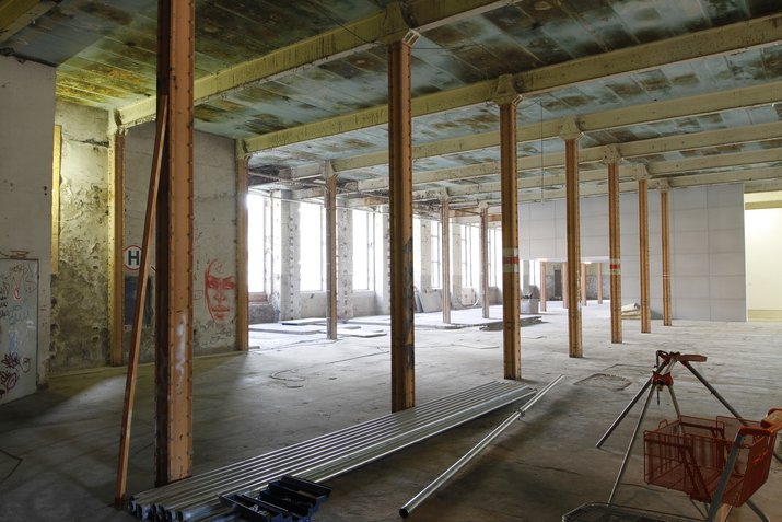 Zwölf Gewerke arbeiten in den nächsten vier Monaten gleichzeitig auf den fünf Etagen der HALLE 14 und bringen die lang ersehnte Gebäudesanierung zu Ende, die mit Dach- und Fassadensanierung im Jahr 2009 begonnen wurde. Zudem wird der Ausbau der Flächen weitgehend abgeschlossen. Für das Kunstzentrum HALLE 14 bedeutet diese umfangreiche Baumaßnahme einen enormen Fortschritt, denn sie ermöglicht sämtliche nutzungsrechtliche Genehmigungen und die Ansiedlung weiterer Ausstellungsflächen (u.a. für Kunstsammler), Atelierräume und Kunstlager.