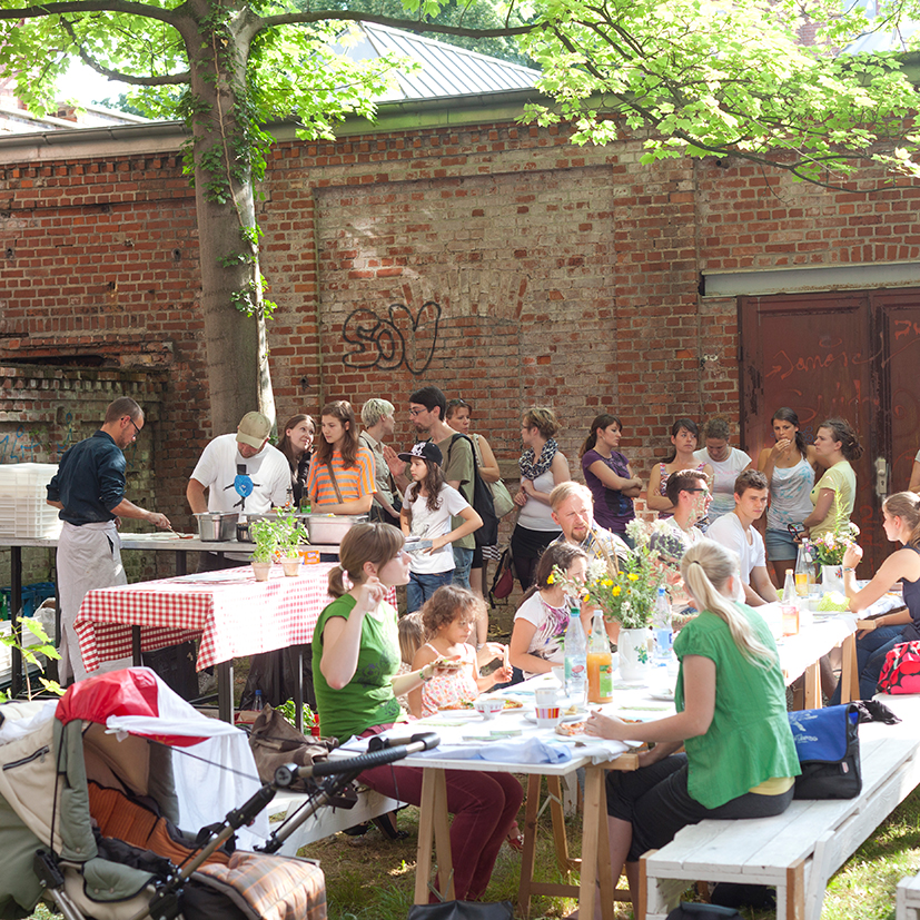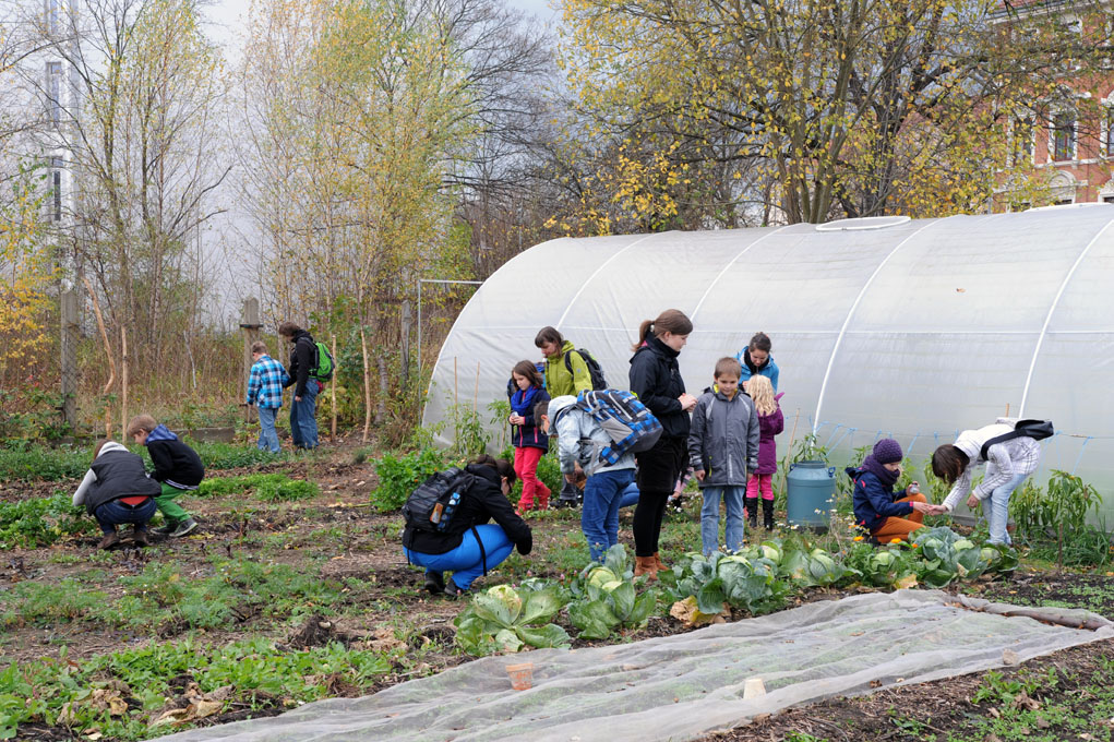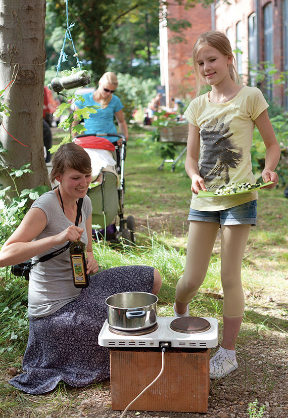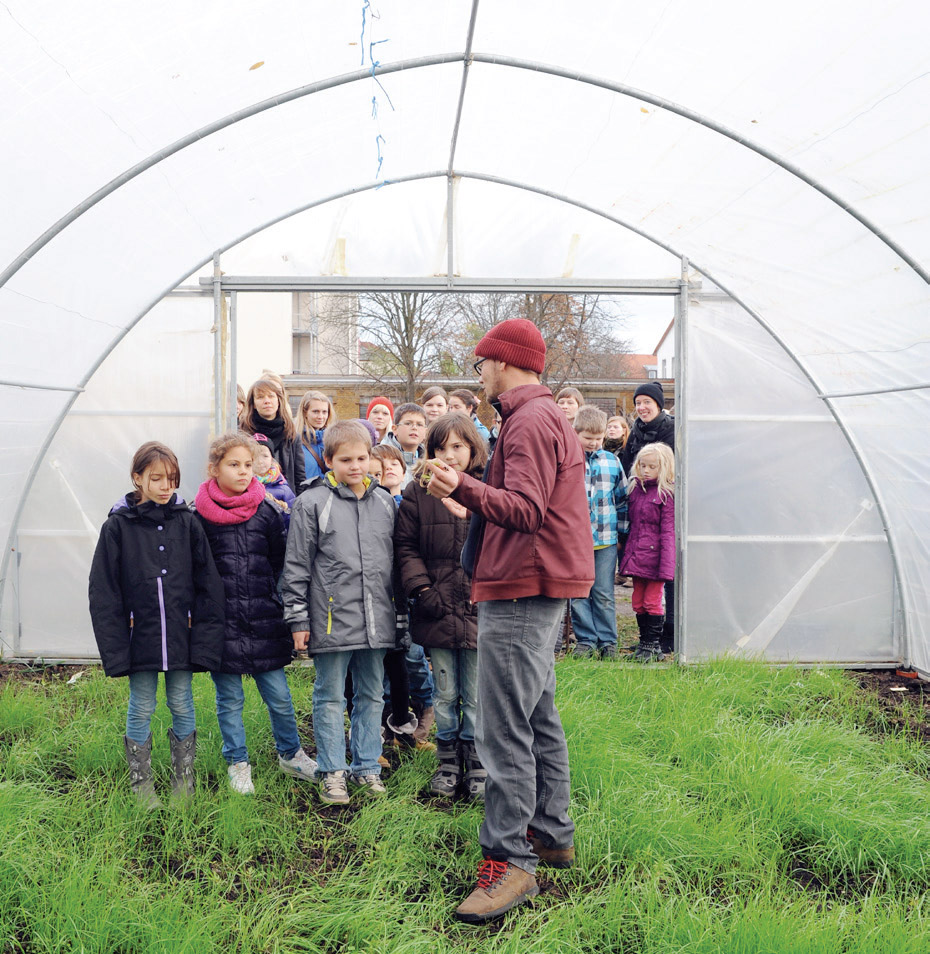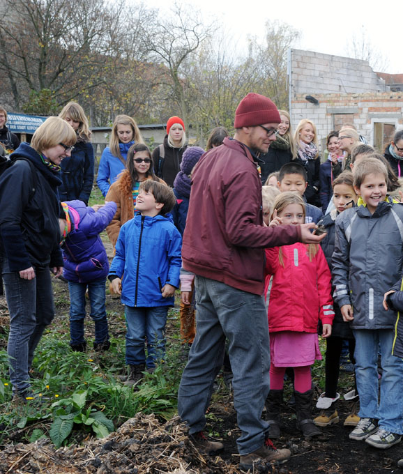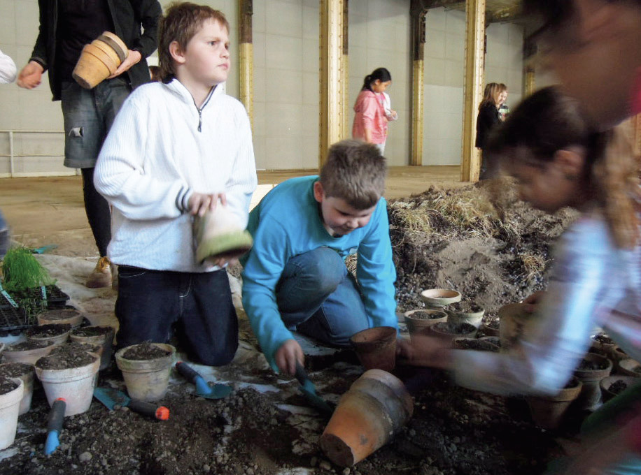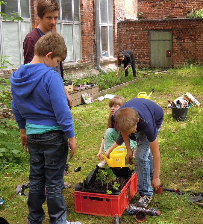 Bis Sommer 2014 kamen die Kinder im Alter von 7 bis 10 Jahren und die Studierenden regelmäßig in die HALLE 14 widmeten sich dem Thema „Gärtnern im städtischen Raum“. Dabei konnten sie durch den eigenen Anbau von Pflanzen in ihrer unmittelbaren Umgebung eine völlig neue Perspektive auf Kunst, Ernährung und biologische Prozesse erlangen und den städtischen Raum auf spielerische und kreative Weise mitgestalten. Zunächst lernten die Kinder den Kunst- und Kulturraum der ehemaligen Baumwollspinnerei Leipzig kennen und konnten in der Ausstellung „The Politics and Pleasures of Food“ der HALLE 14 erste Erfahrungen in der Begegnung mit Werken und Strategien der zeitgenössischen Kunst sammeln.