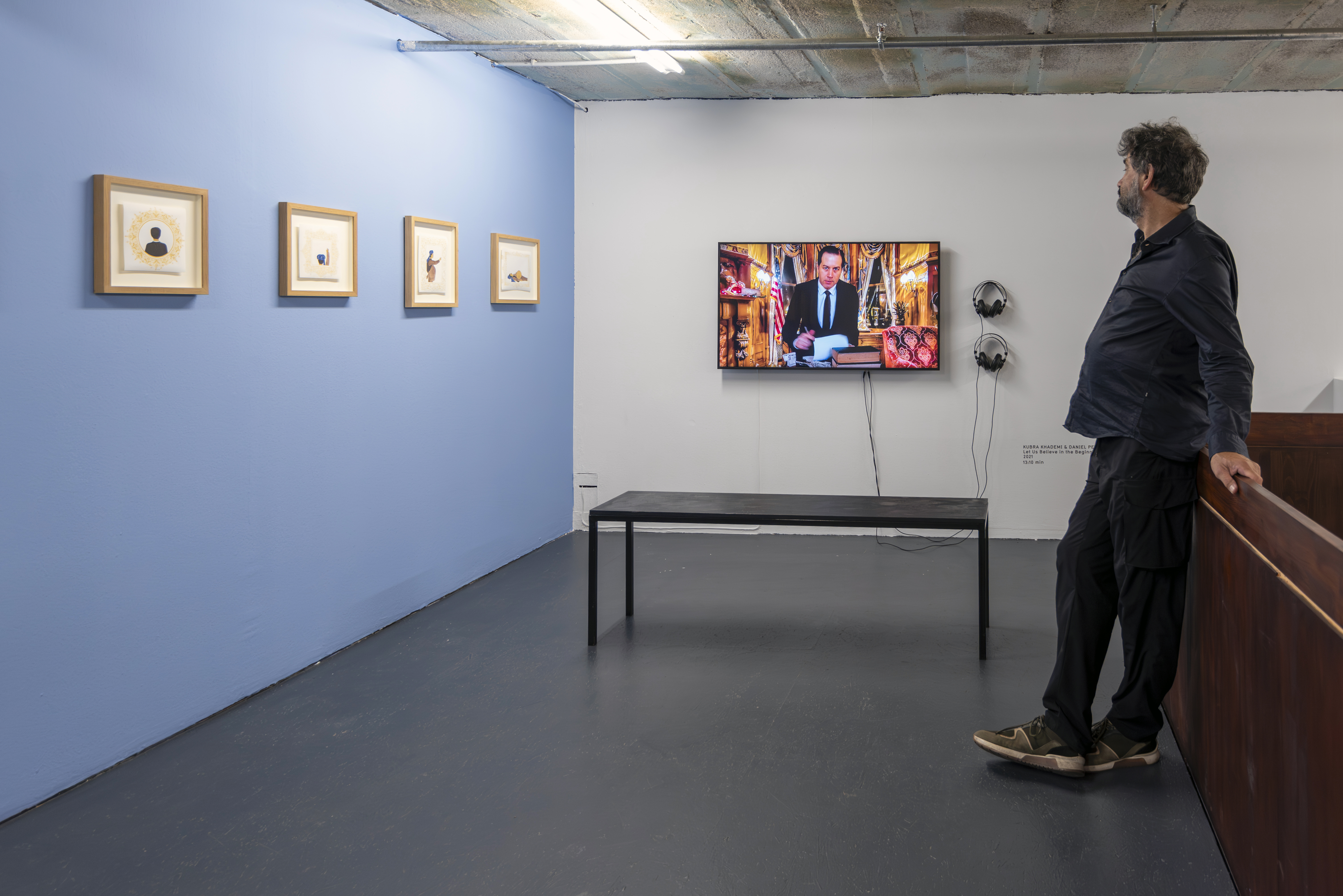 Abb.: Kubra Khademi & Daniel Pettrow, Untitled #01-14 (2021) und Let us Believe in a Beginning of the Hot Season, (2021) Ausstellungsansicht, Foto: HALLE 14 | Büro für Fotografie