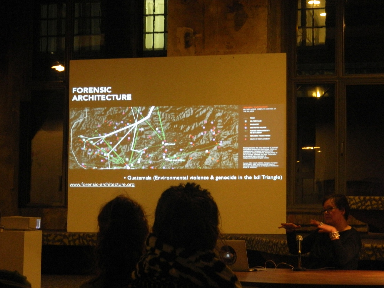 Susan Schuppli ist Künstlerin, Autorin, Filmemacherin, promovierte Kulturwissenschaftlerin, Forscherin und, genau genommen, auch Kriminologin. Als eine führende Kraft im Forschungsprojekt „Forensic Architecture“ am Centre of Research Architecture der Goldsmiths University London, beschäftigt sie sich damit, wie man die Historizität bestimmter Orte mithilfe verschiedener bildgenerierender Verfahren und Technologien rekonstruieren kann. Im Zentrum der Untersuchungen stehen solche Orte, an denen sich einst größere Gewaltverbrechen ereignet haben, aber kaum noch etwas von diesen zeugt. Bei der „forensischen Architektur“ geht es daher um Methoden der Sichtbarmachung solcher Verbrechen, um eine Beweisfindung für Menschenrechtsverletzungen bis hin zu Massakern. Das stark transdisiplinär arbeitende Team der Londoner Forensiker nutzt hierfür sowohl wissenschaftliche, als auch künstlerische Techniken und Ansätze: eine Analyse von Satellitenaufnahmen, GPS oder Radarbildern wird mit filmischem Material wie Footage, Dokumentar-aufnahmen und Fotografien sowie mit Kartografien von Gebäuden und Gelände kombiniert. Mit ihren eindrucksvollen Ergebnissen konnten die Forscher schon mehrfach Menschenrechtsorganisationen oder die Vereinten Nationen bei der Anklage und Überführung von Kriegsverbrechern unterstützen.