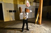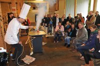 Dabei sind ihm alle Mittel recht. Er kocht mit selbstgebauten Tauchsiedern oder bastelt eigenes Besteck aus dafür völlig ungeeignet scheinendem Material. Dazu baut er eine eigens dafür angefertigte mobile Kücheninsel nebst zugehöriger Tafel auf. So werden die Besucher der HALLE 14 an zwei Tagen in eine Art „Neue Steinzeit“ geführt.