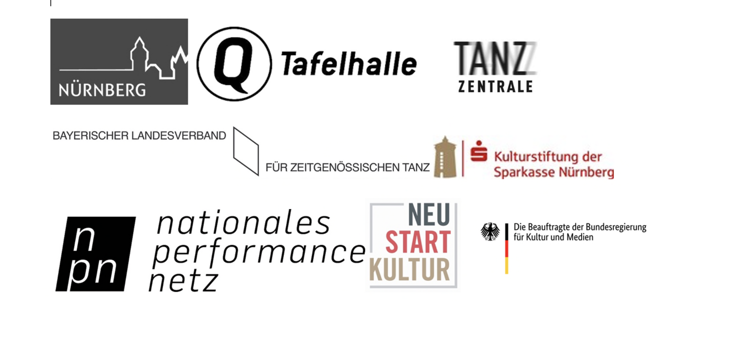 Eine Koproduktion mit der Tafelhalle Nürnberg, gefördert durch die Impulsförderung der Stadt Nürnberg und die Sparkassen Kulturstiftung, in Kooperation mit der Tanzzentrale der Region Nürnberg/Fürth e. V. Dieses Projekt wird ermöglicht durch den Bayerischen Landesverband für zeitgenössischen Tanz (BLZT) aus Mitteln des Bayerischen Staatsministeriums für Wissenschaft und Kunst. Unterstützt durch das NATIONALE PERFORMANCE NETZ – STEPPING OUT, gefördert von der Beauftragten der Bundesregierung für Kultur und Medien im Rahmen der Initiative NEUSTART KULTUR. Hilfsprogramm Tanz.