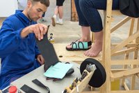 Im Rahmen der aktuellen Ausstellung »Neue Urbane Produktion« stellt der Künstler Leon Kucharski diese Wertschöpfungsstrategie in Frage indem er den individuellen und manuellen Herstellungsvorgang offen zeigt.
